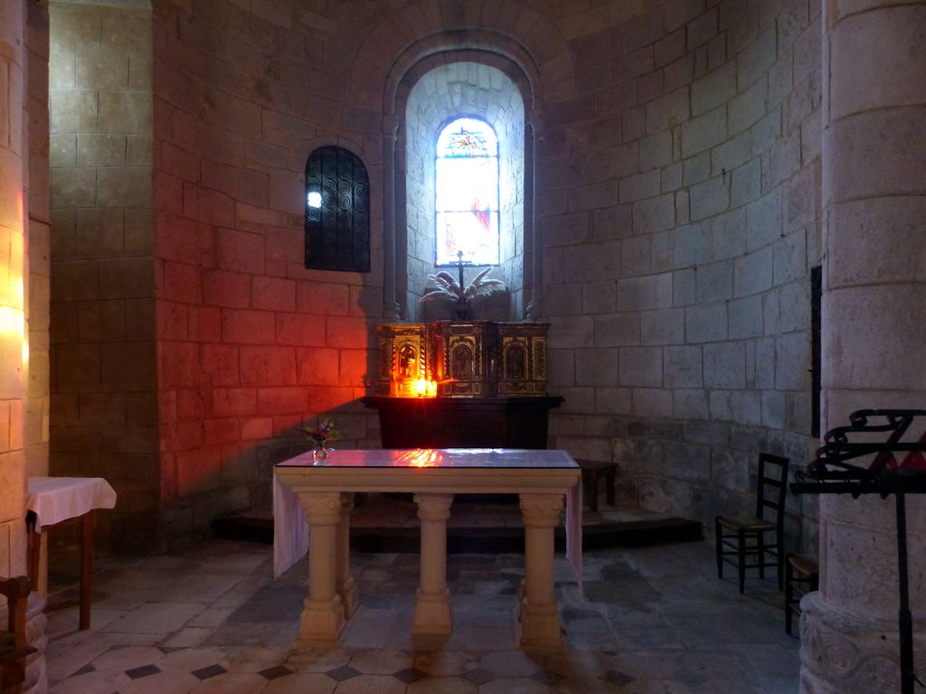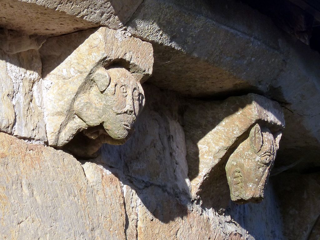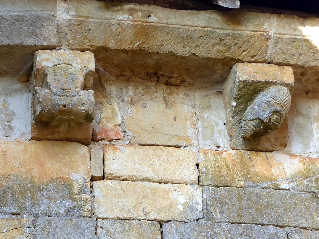 La corniche de l’abside repose sur une série de modillons sculptés, figures géométriques au nord, masques humains au sud.