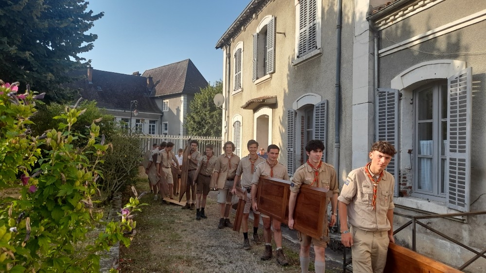 Cet important déplacement de mobiliers, de livres, de dossiers et d’effets divers a été réalisé grâce à la présence de dix Routiers du Clan Saint-Denis, venus de Montfort L’Amaury, en région parisienne, pour effectuer un service au profit de notre paroisse, dans le cadre de leur camp d’été.