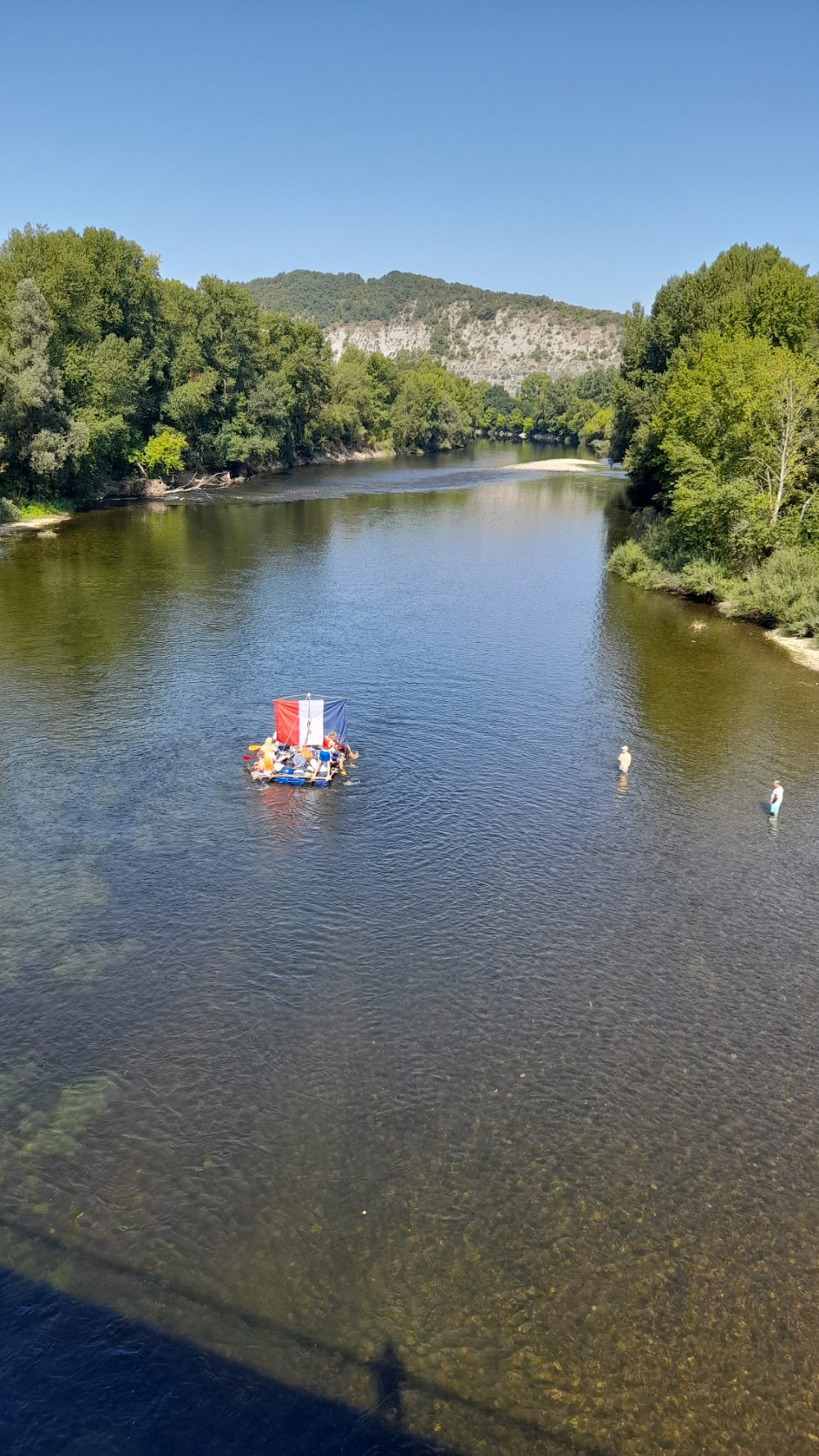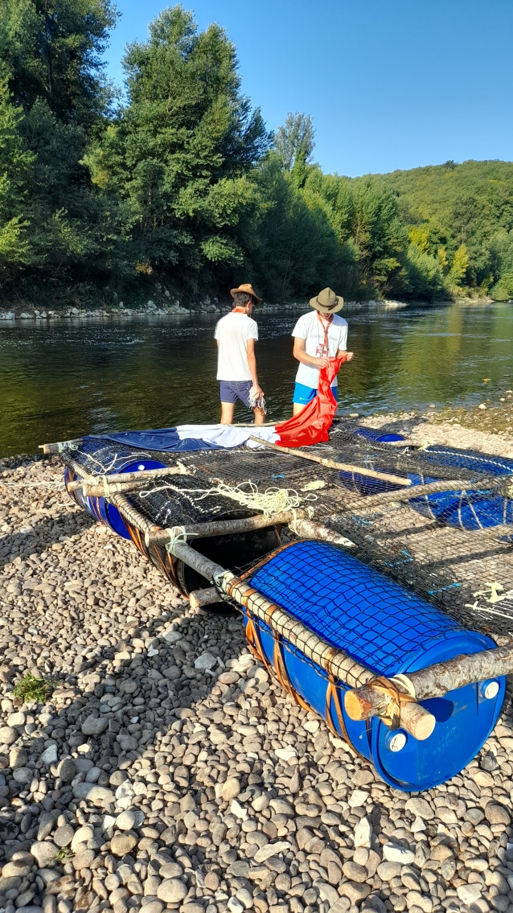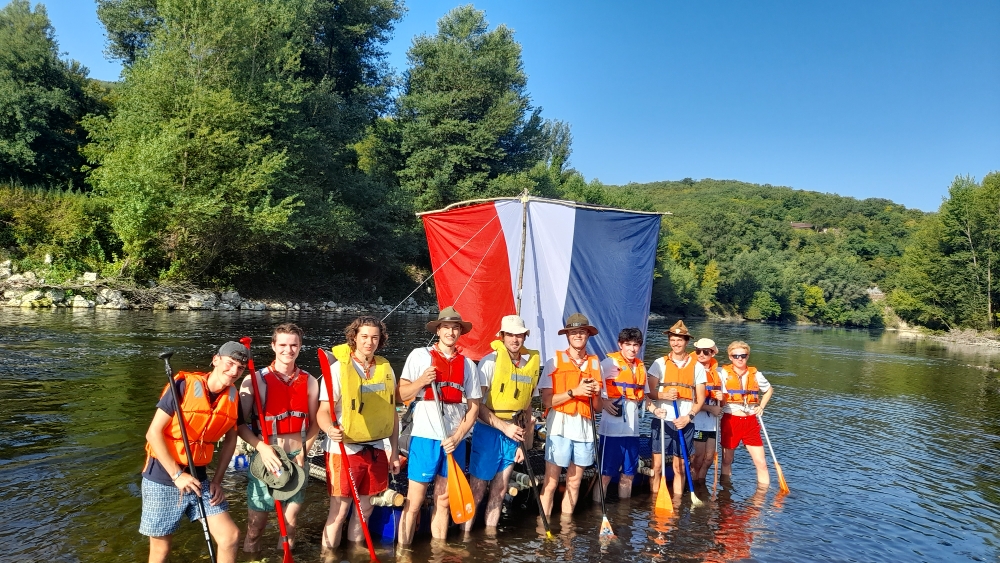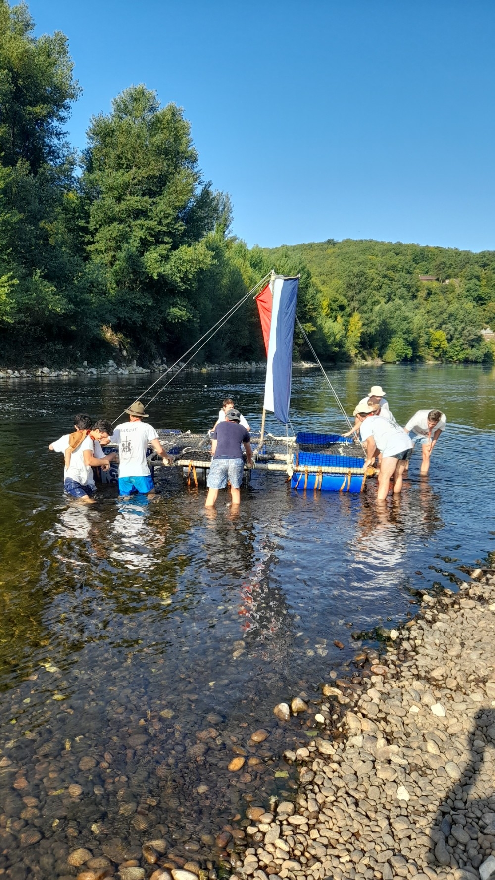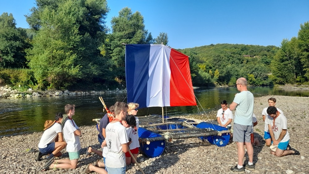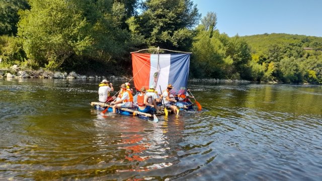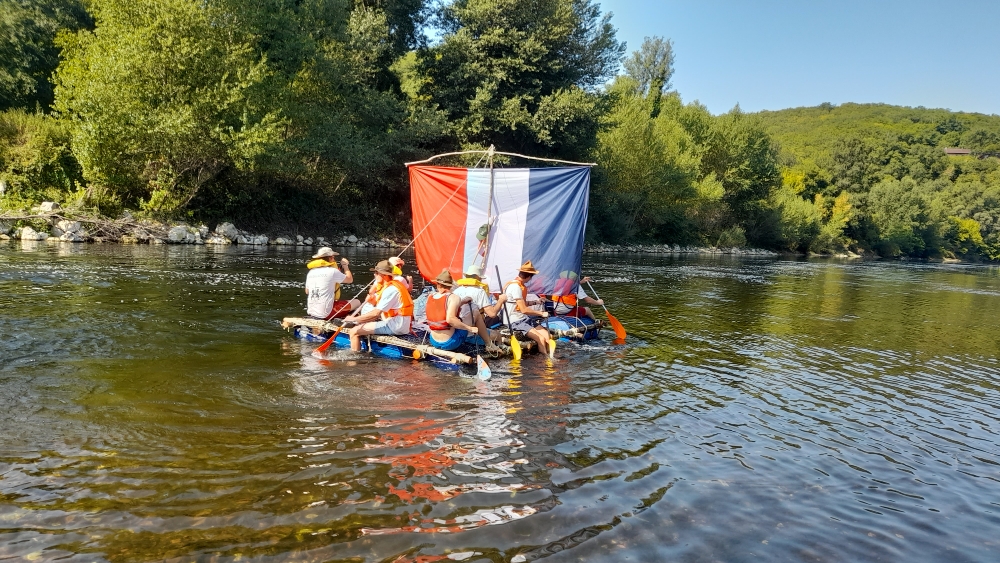 Puis à l’issue, après avoir accueilli les prêtres et quelques paroissiens pour une veillé bien sympathique au milieu de la Dordogne, ils ont mis à l’eau le radeau qu’ils avaient confectionné pendant leur temps libre et ont pris le large sur la Dordogne.