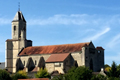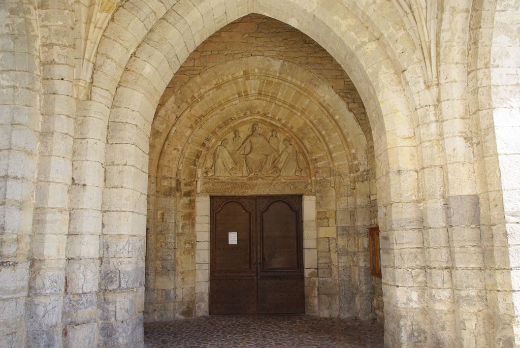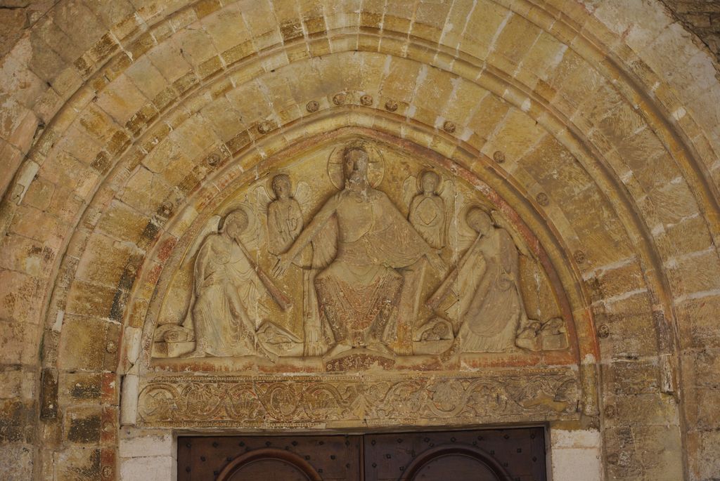 A l’entrée se situe un tympan remarquable qui lui date de l’église primitive ; tympan sculpté qui date de la seconde moitié du XIIe. Il représente la seconde Parousie du Christ (apparition du Christ) juste avant le Jugement Dernier dont l’imminence relève de la présence de 2 anges sonnant de la trompette et par les ressuscités qui soulèvent le couvercle de leur tombeau.