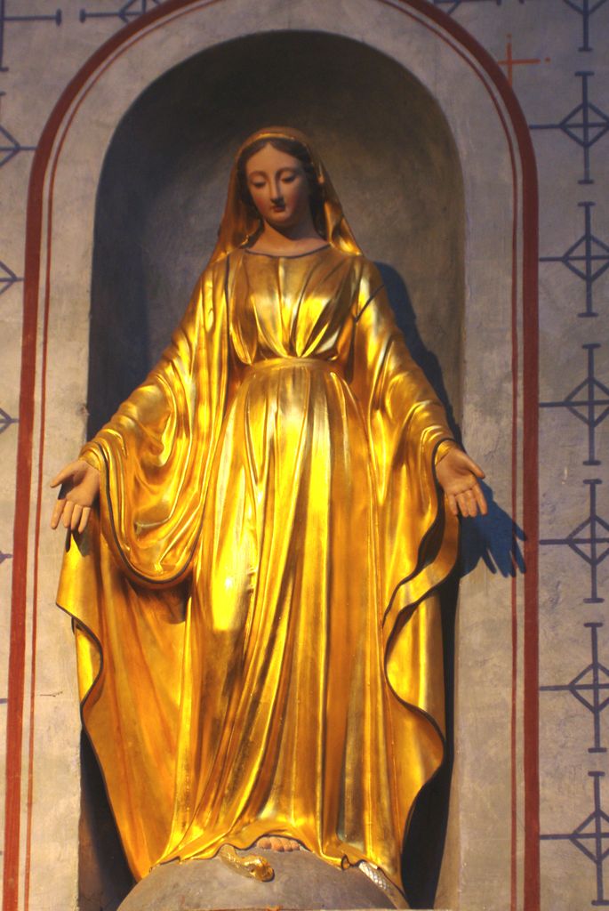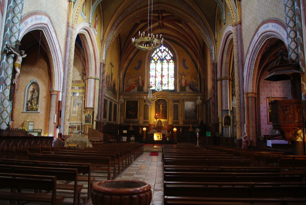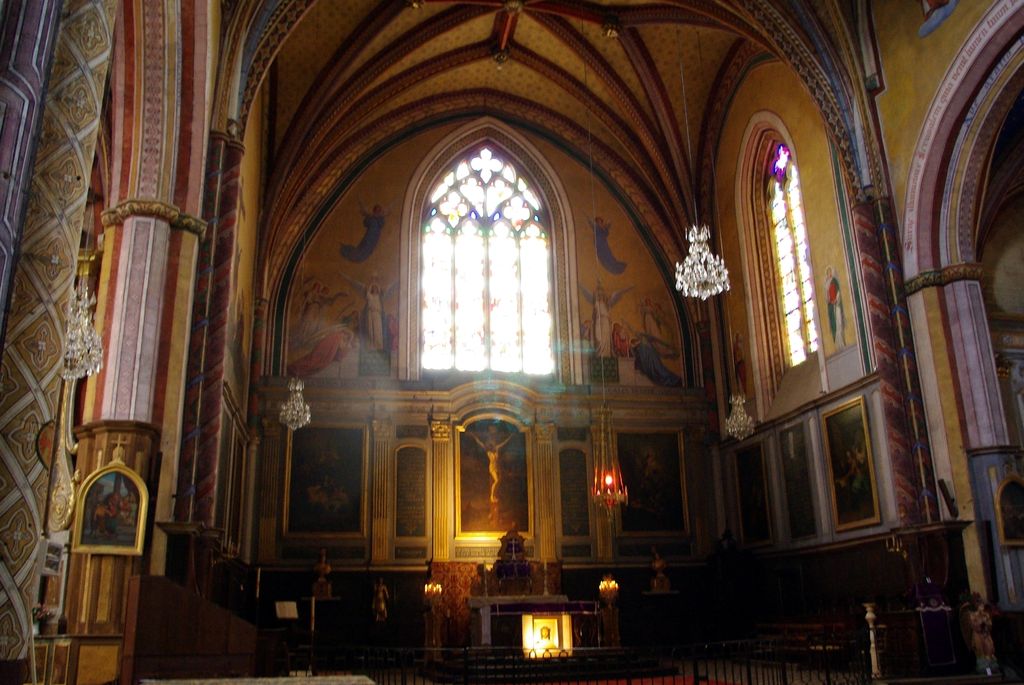 Une fois le tympan franchi, s’ouvre la nef centrale gothique avec une distribution de 4 chapelles dédiées à gauche et à droite ; cet ensemble très coloré entièrement rénové à l’identique.