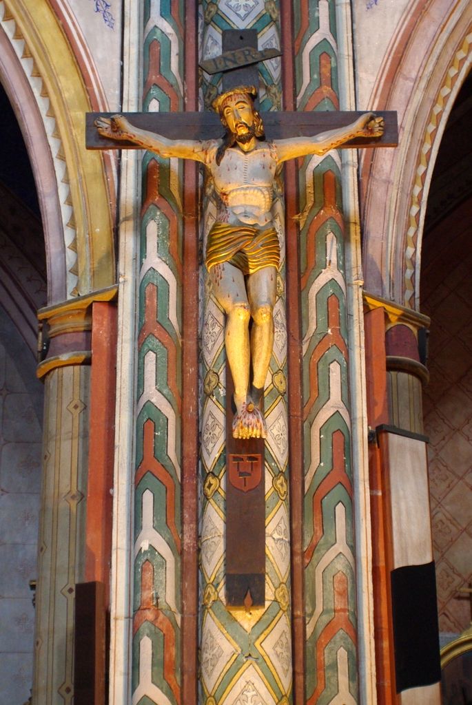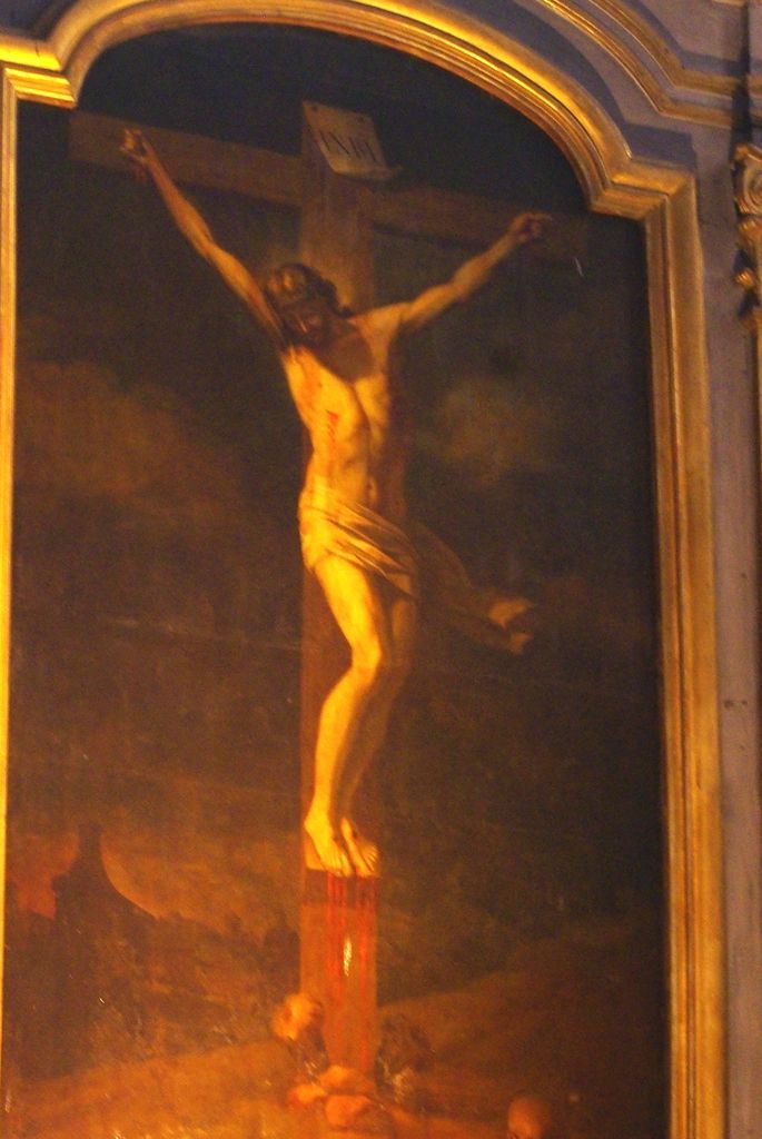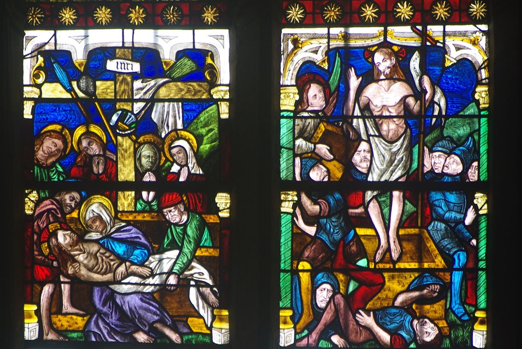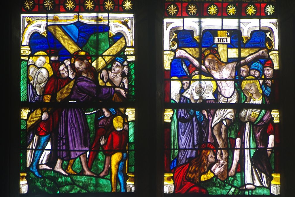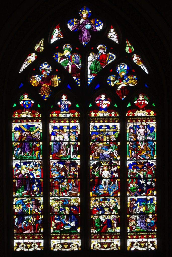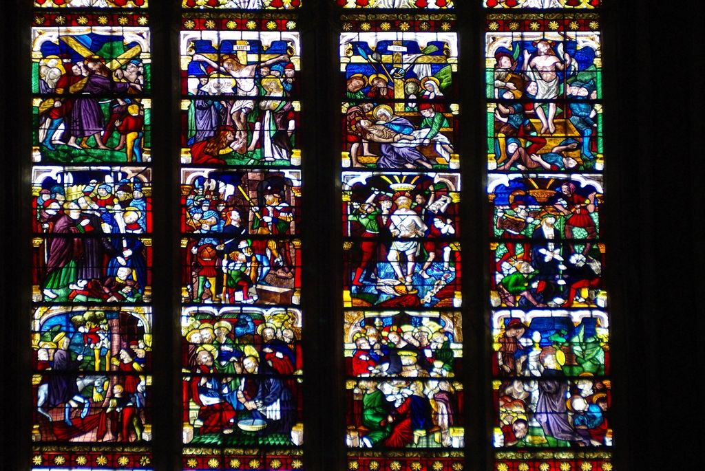 Au fond, au-dessus de l’autel, vous pouvez admirer la verrière centrale du XVIe qui, a elle seule, est une véritable catéchèse sur la Passion du Christ.