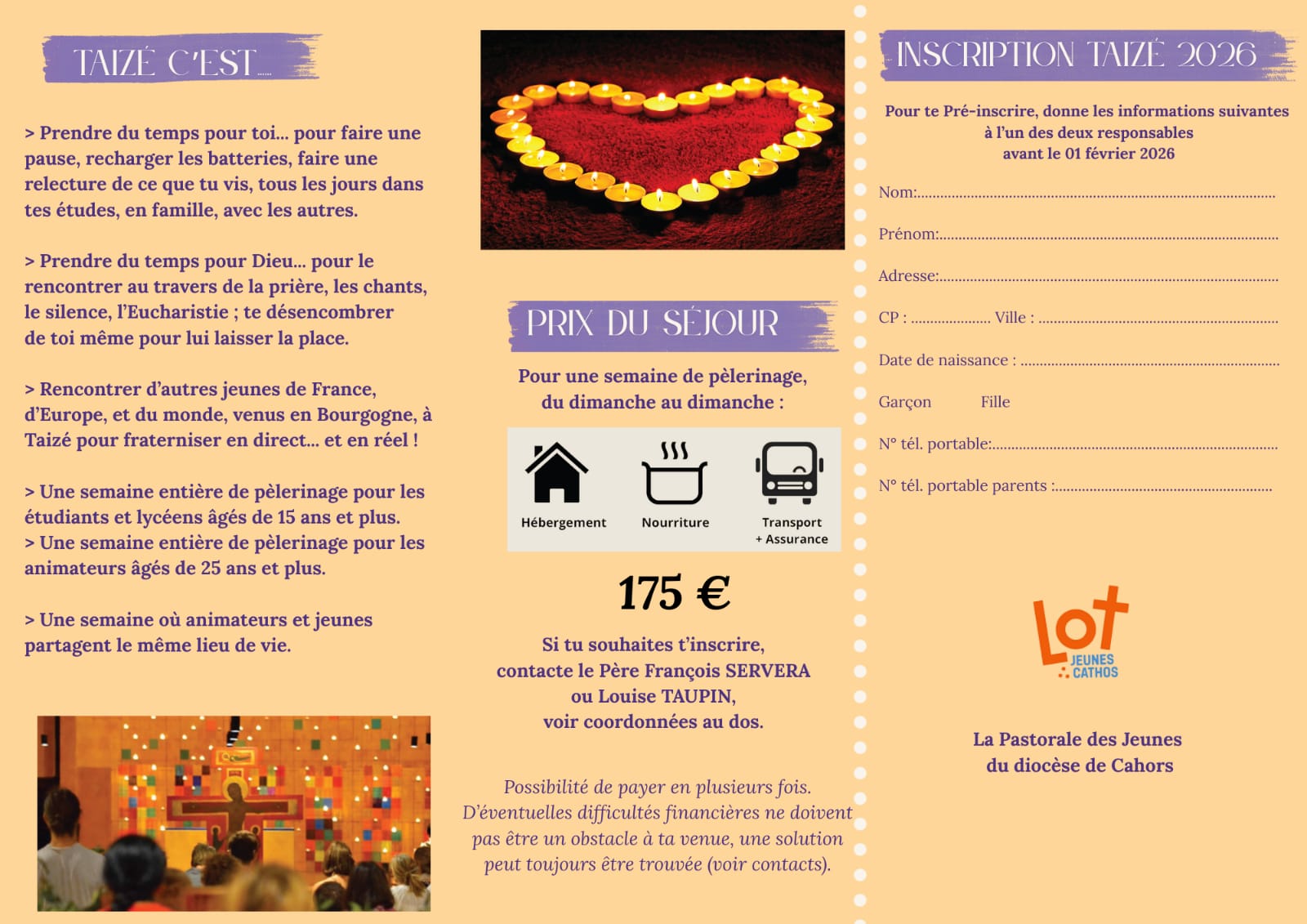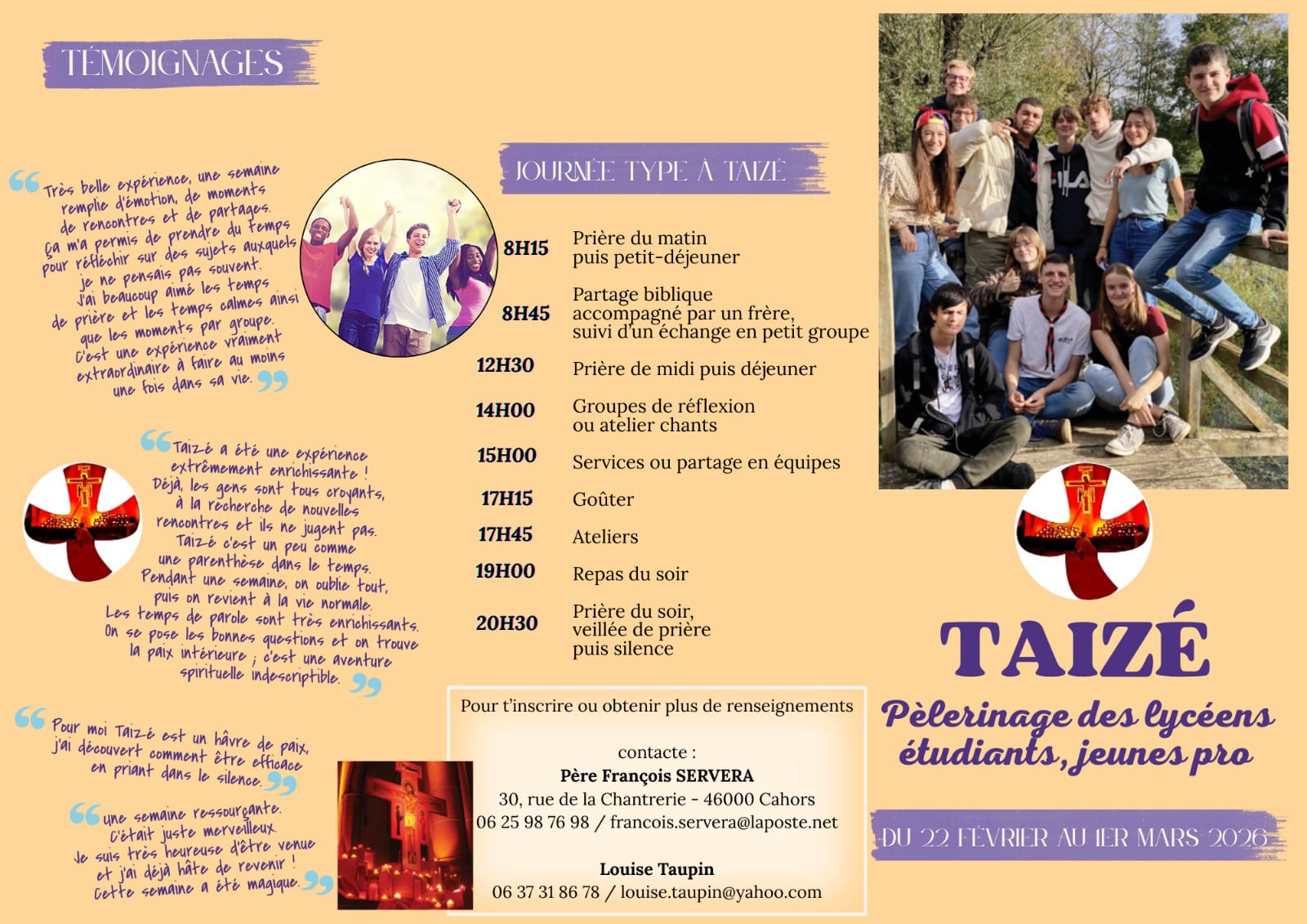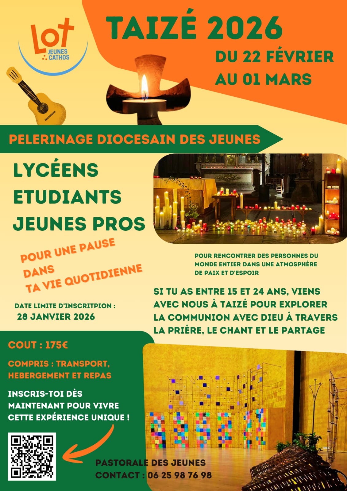 Pélerinage Taizé 2026 Samedi 27 décembre 2025, par JFR Evènements | Du 22 février au 1er mars 2026 Pèlerinage Diocésain des Jeunes Lycéens, Etudiants Jeunes Pros Affiche : Programme : Inscription :